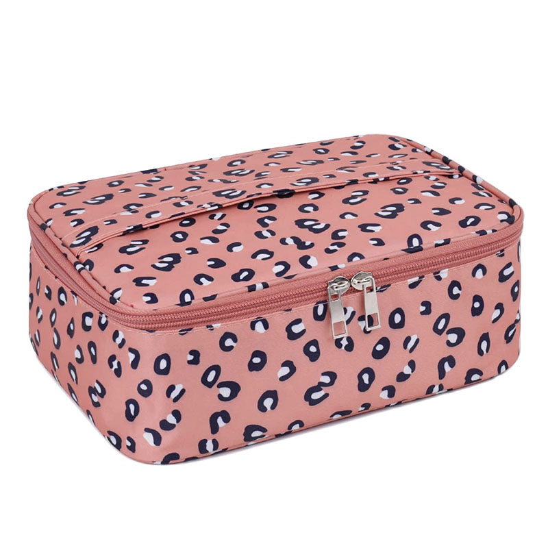 - Múltiples compartimentos: con varios petos e compartimentos, esta bolsa de cosméticos ten moito espazo para gardar todo, desde os teus batoms favoritos ata os teus pinceis.
